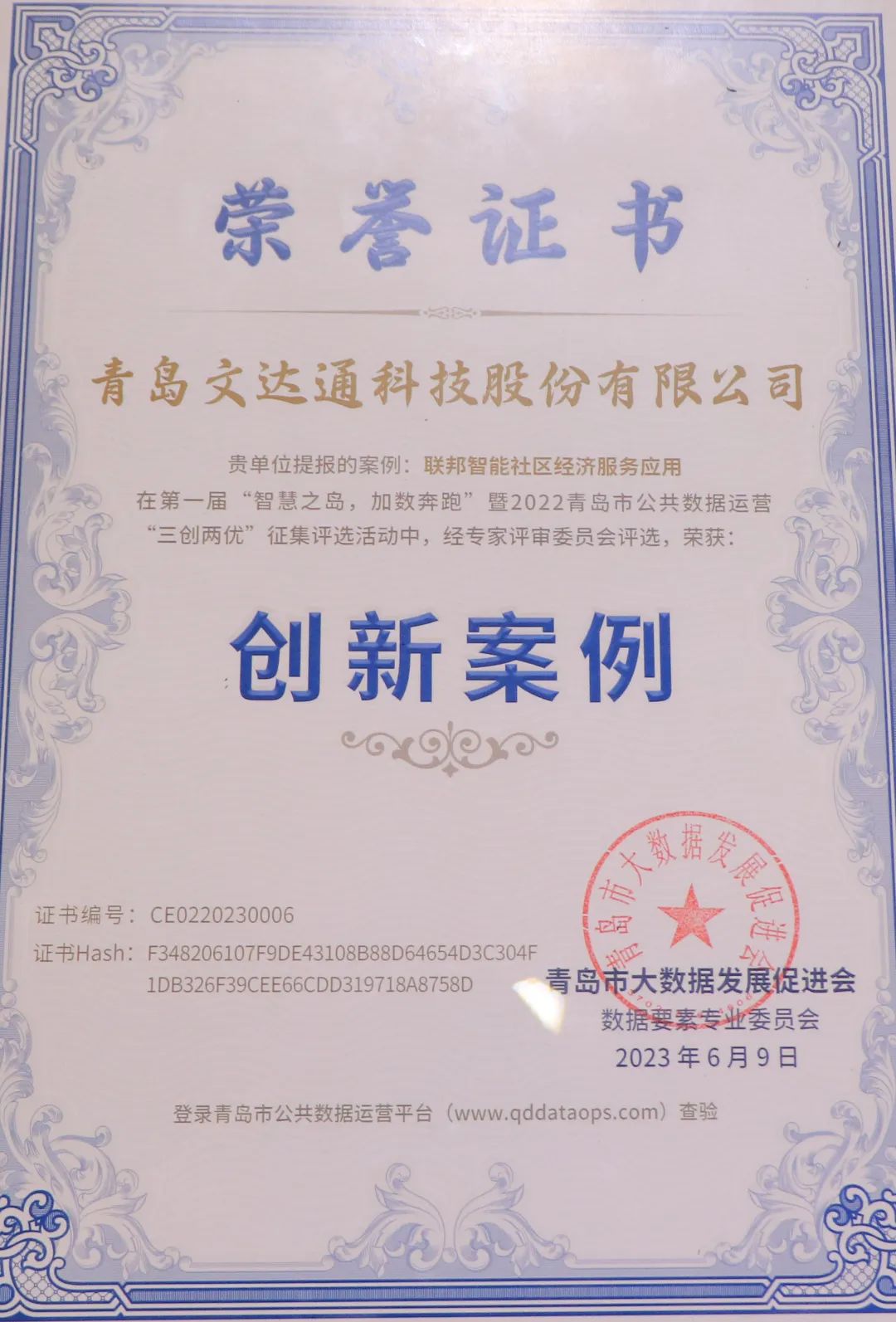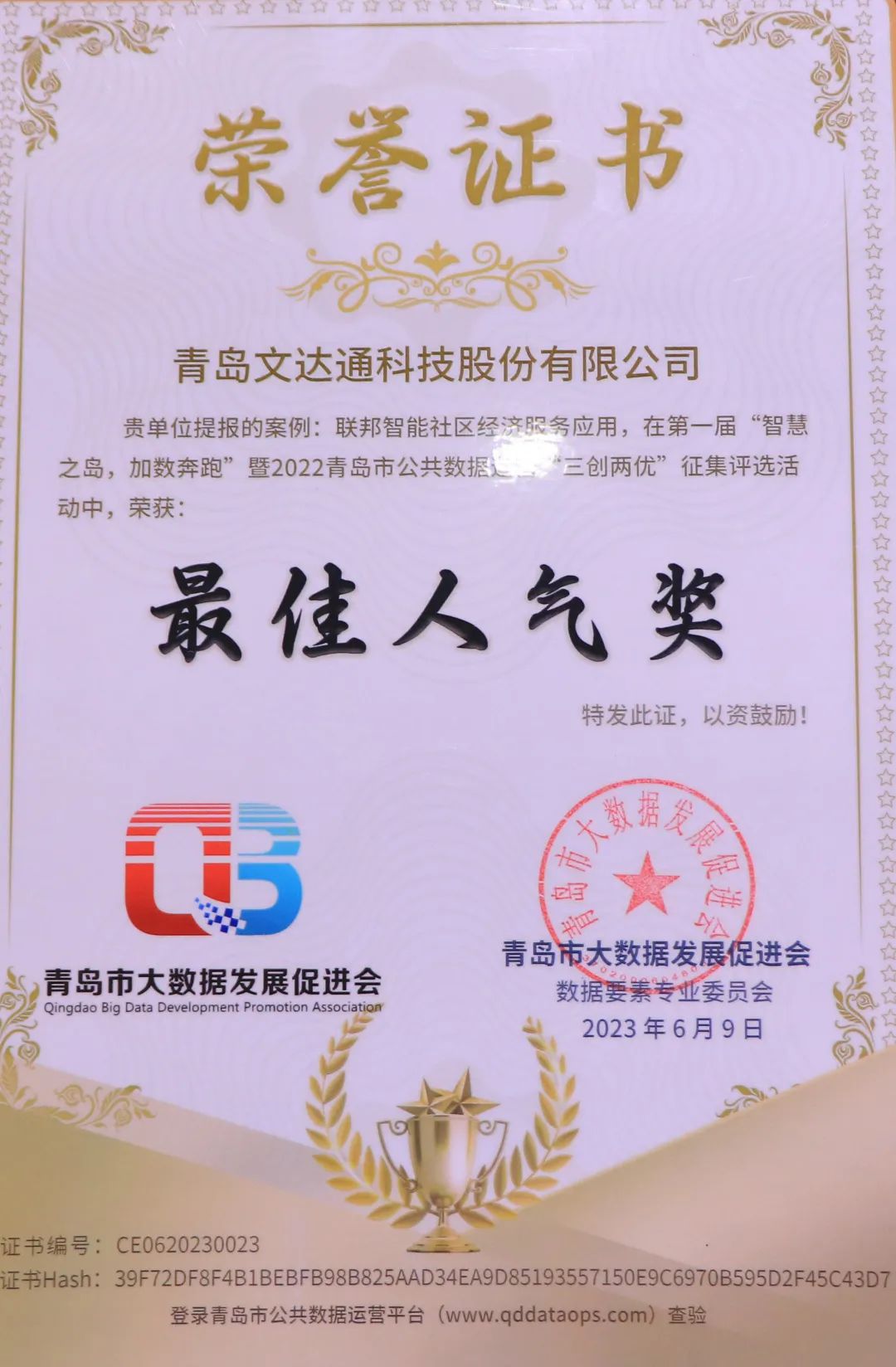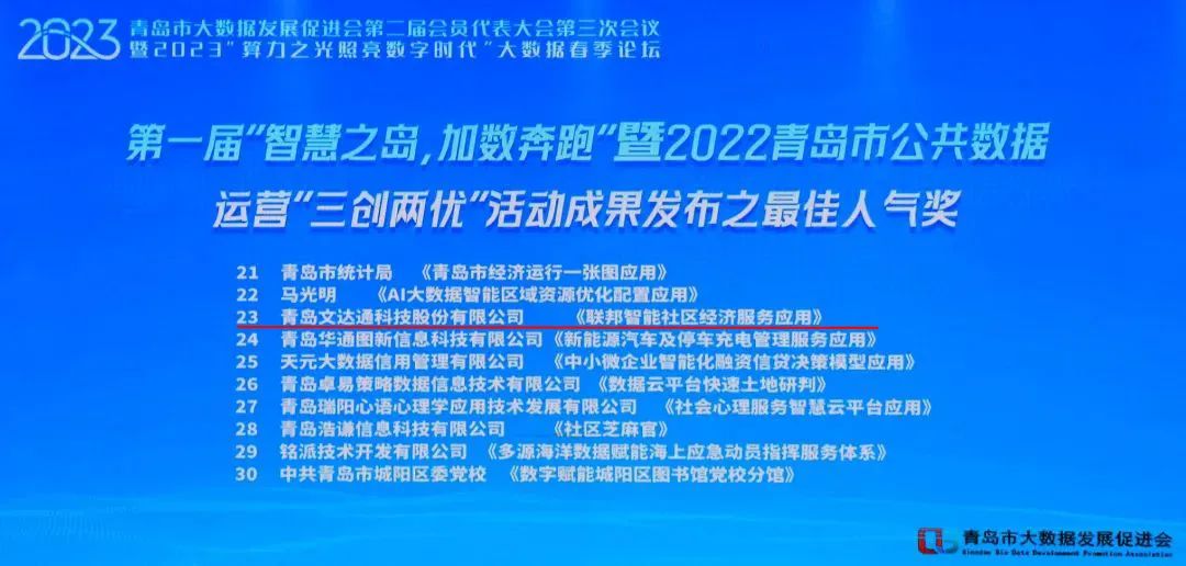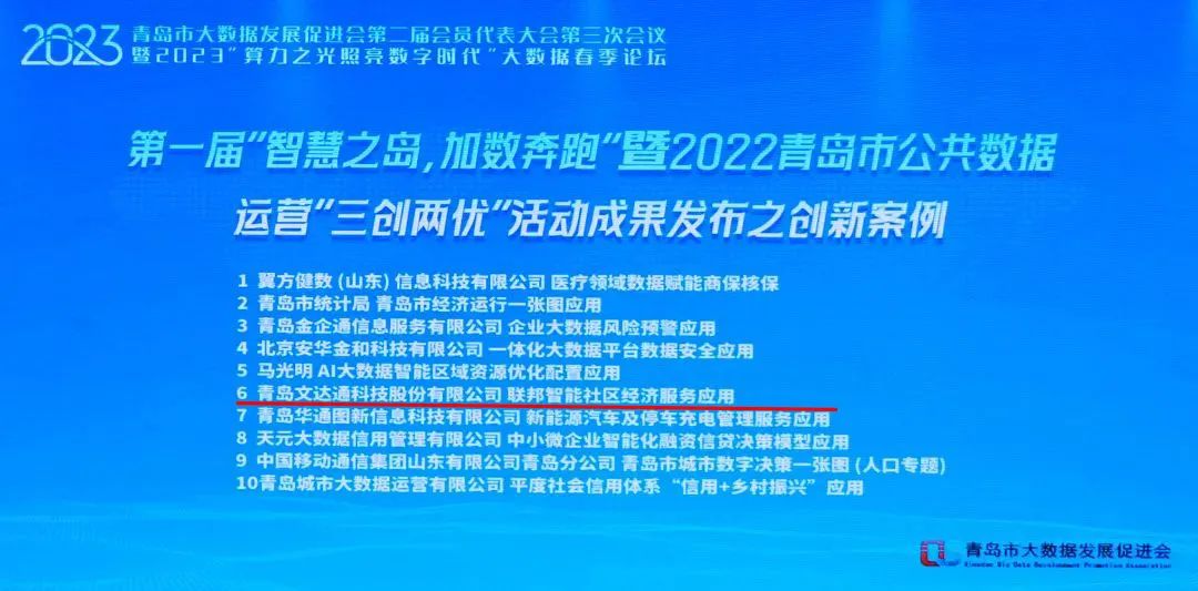 6月9日下午,青島市大數(shù)據(jù)發(fā)展促進(jìn)會(huì)第二屆會(huì)員代表大會(huì)第三次會(huì)議暨“算力之光 照亮數(shù)字時(shí)代”大數(shù)據(jù)春季論壇在青島市市級(jí)機(jī)關(guān)會(huì)議中心隆重召開(kāi)。會(huì)議由青島市大數(shù)據(jù)發(fā)展管理局指導(dǎo),青島市大數(shù)據(jù)發(fā)展促進(jìn)會(huì)主辦,以“算力之光 照亮數(shù)字時(shí)代”為主題,交流行業(yè)發(fā)展趨勢(shì),解讀政策規(guī)劃,展示年度大數(shù)據(jù)成果。同時(shí),本次大會(huì)也對(duì)獲獎(jiǎng)企業(yè)進(jìn)行了表彰授獎(jiǎng)。其中,文達(dá)通股份提出的“1+1+3+N”智慧社區(qū)運(yùn)營(yíng)創(chuàng)新模式榮獲2022年新型智慧城市優(yōu)秀案例擴(kuò)面打榜一等獎(jiǎng);提出的聯(lián)邦智能社區(qū)經(jīng)濟(jì)服務(wù)應(yīng)用榮獲“優(yōu)秀創(chuàng)新案例”以及“最佳人氣獎(jiǎng)”;文達(dá)通股份榮獲青島市大數(shù)據(jù)發(fā)展促進(jìn)會(huì)2022-2023年“優(yōu)秀會(huì)員單位”稱(chēng)號(hào)。